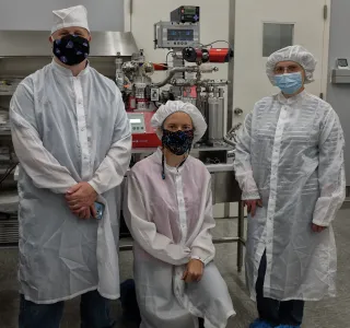 Installation at Johnson Space Center.  From left – Ryan Zeigler, Apollo Sample Curator, NASA (PhD Washington University, 2005); Juliane Gross, Deputy Curator of Apollo samples; Olga Pravdivtseva, WashU Physics.