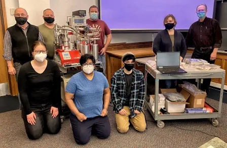 The WashU team, from left to right: Prof. Alex Meshik, postdoc Dr. Patrizia Will (kneeling), machinist Dennis Huelsman, Prof. Rita Parai (kneeling), machinist Kenny Schmidt, lab assistant Julian Rodriquez (kneeling), Prof. Olga Pravdivtseva, and Prof. Brad Jolliff.