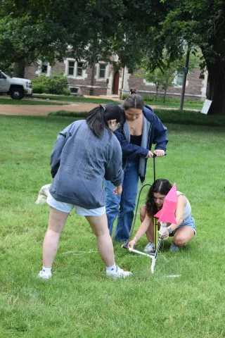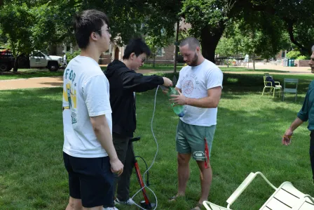 On Thursday, July the 11th, 2024, students from the summer Physics 191 Introduction to Physics course held a capstone event fit to bring together a semester of hands-on learning. This event was the annual Water Rocket Competition, organized by class instructor Reza Khanbabaie and physics department grad student Hamta Farrokhi, and aided by physics faculty Mairin Hynes and staff member Sean Ehle.